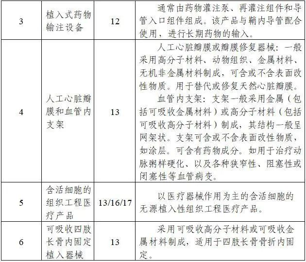 二、调整部分产品类别和描述。将“植入式心脏起搏器、植入式心脏除颤器、植入式心脏再同步复律除颤器”调整为“植入式心脏节律管理设备”,“植入式血泵”调整为“植入式心室辅助系统”,“植入式药物灌注泵”调整为“植入式药物输注设备”,“境内市场上尚未出现的血管内支架系统”调整为“人工心脏瓣膜和血管内支架”;将“境内市场上尚未出现的植入性人工器官、接触式人工器官、骨科内固定产品及骨科填充材料”调整为“含活细胞的组织工程医疗产品”;将“可吸收四肢长骨内固定产品”调整为“可吸收四肢长骨内固定植入器械”。相应的产品描述也进行了细化和明确。